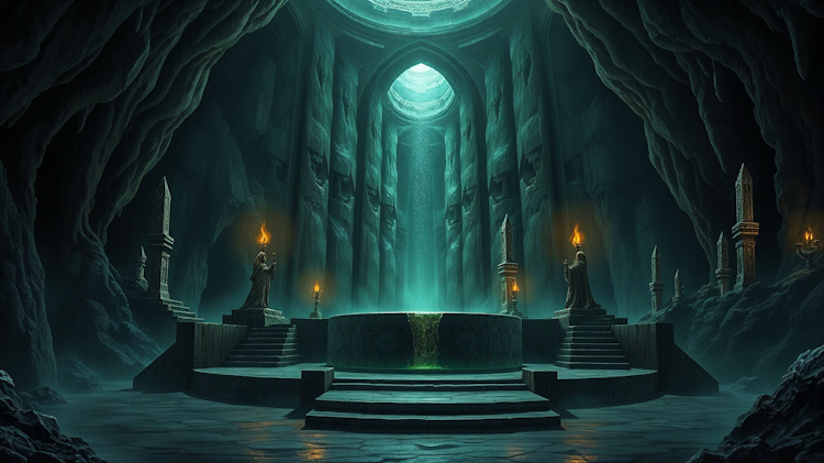 The zealots carved a winding path through this forest of stalagmites, marking it with torches set at eye level that could be magically lit to guide those who knew the way. This path meandered and twisted through the natural formations, turning this way and that in a deliberate maze-like pattern, until it reached the heart of the temple. At the center of this chamber, the zealots constructed their masterwork: a raised platform or dais reached by carved stone steps. These steps encircled the entire platform, allowing approach from multiple directions, and it was upon this elevated structure that they would place the Well of Darkness itself. But before the Well could be created, they needed guardians—or rather, the appearance of guardians, for what they built would serve a far darker purpose than protection.