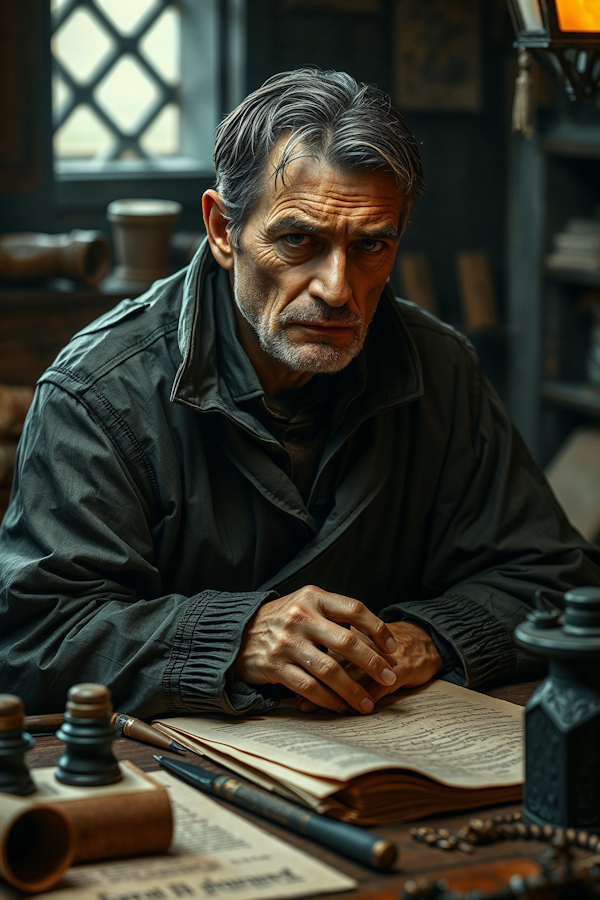 He is about forty, slight of build, with thinning dark hair going gray at the temples and the permanently ink-stained fingers of someone who has held a quill more often than anything else in his life. His clothes are good quality — the wardrobe of a tradesman who takes pride in his station, though they tend toward rumpled by day's end. He is not a man who commands attention when he enters a room. He is the man who prepares the documents for the men who do.