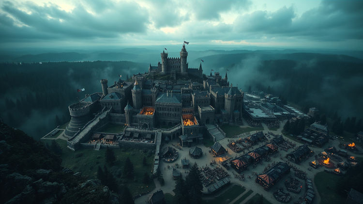 The settlement consists of two distinct layers. At its core rises the original fortress, a walled stronghold that has changed hands and purpose many times since its founding. Around it, a sizeable town has grown over the centuries, its streets and districts shaped by the needs of commerce, craftsmanship, and the ever-present mercenary trade. Beyond the town walls, a sprawling encampment of mercenary companies expands and contracts like a living thing, swelling when conflict between the lords intensifies and shrinking when temporary truces hold. This camp has developed its own economy of provisioners, smiths, moneylenders, taverns, and combat arenas, creating a chaotic yet functional marketplace that coexists with the more established businesses within the walls.