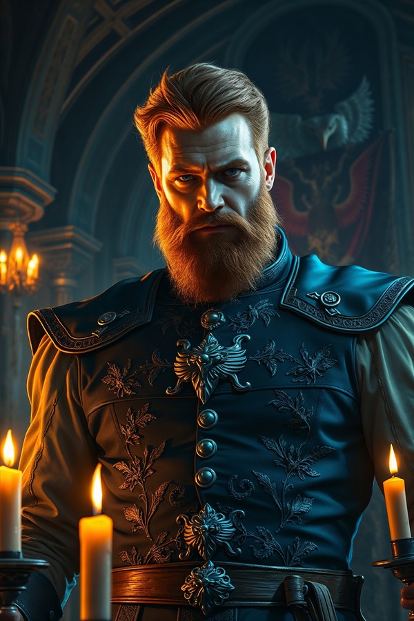Caldwell himself fits the setting. Mid-forties, with a battlefield physique that his fine clothing cannot quite conceal, he carries himself with the effortless poise of a man born to command. His midnight-blue doublets and silver-thread embroidery project refinement, while the calculating coldness in his eyes suggests that refinement has its limits. His face might be handsome if it weren't so guarded — a neatly trimmed reddish-brown beard framing features that reveal exactly as much as he wants them to and nothing more. He speaks smoothly, flatters precisely, and manages people with the practiced ease of someone who has spent a lifetime ensuring others do what he needs without ever quite realizing they've been steered.