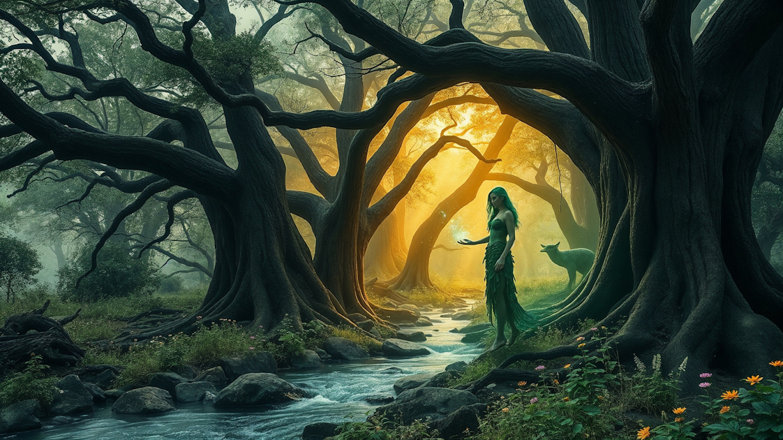 The dryad, or tree nymph, is an ancient faerie creature inexorably linked to nature and the woods they inhabit by powerful bonds of magic. These ethereal beings are cousins to the nereids, or water nymphs, and represent one of the oldest forms of fey life, their existence predating even the Age of the Old Gods. Found only deep within the most ancient of forests, dryads are beautiful creatures standing about five feet tall, with emerald eyes, long green hair, and jade-colored skin. Each dryad is bound to a specific oak tree from which she emerged, unable to stray more than 360 yards from her symbiotic partner without experiencing progressive weakness that will eventually result in death. This tree-bond defines their existence—they will live for as long as their oak does, typically six hundred years or more, and when the tree dies, so too does the dryad.