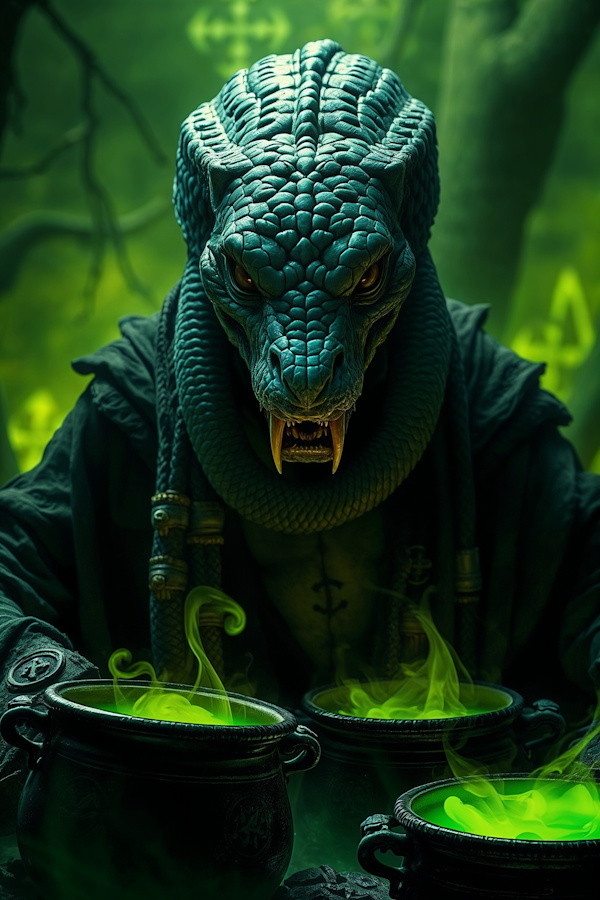 In the fetid depths of the Grimmere, where the waters run black and the trees twist into grotesque shapes beneath perpetual mist, there emerged a sitheri whose ambition would exceed the bounds of her reptilian nature and whose hunger for power would corrupt not only her physical form but the very essence of what she had been. Saress was born into the Okzimba-ma brood, a tribe known among the ten sitheri nations for their particular devotion to the darker aspects of their serpentine gods and their willingness to embrace sacrificial practices that even other sitheri found excessive. From her earliest moments, she exhibited the sleek blue and green scales that marked her as one of the brood's most promising daughters, her coloring vibrant and pure in a way that suggested both beauty and deadliness in equal measure.