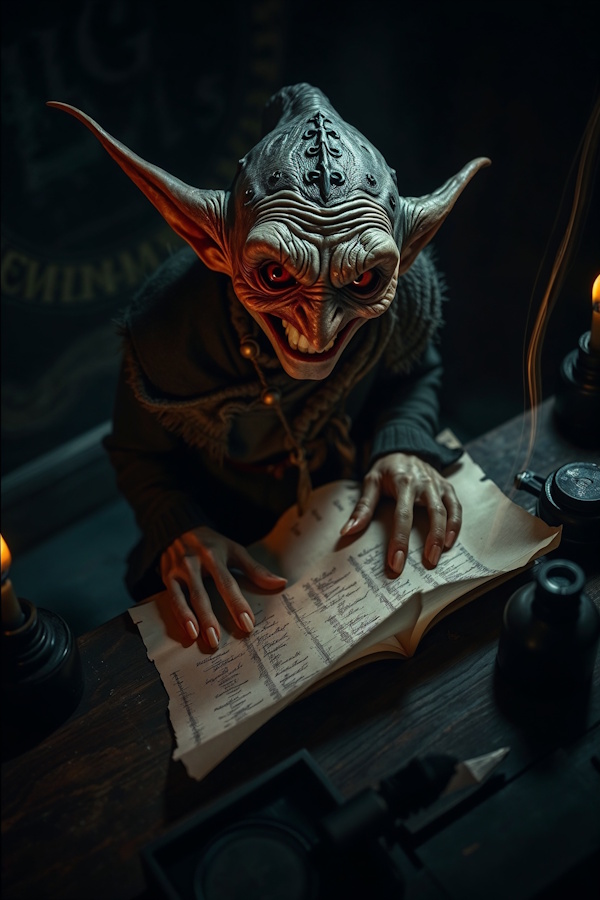 Even among grekkels, who stand as the smallest and most devious of the goblin races, Skritch occupy a position of diminutive distinction. Standing barely eighteen inches tall with a build so slight that he appears almost skeletal, he possesses all the characteristic features of his breed but in an even more concentrated form. His yellow eyes, though dimmed by years of close work in poor lighting, retain the sharp intelligence that marks successful grekkels. The long, hooked nose that dominates his narrow face gives him an appearance of perpetual calculation, while his gangly arms and three-fingered hands move with the precise dexterity that his profession demands.