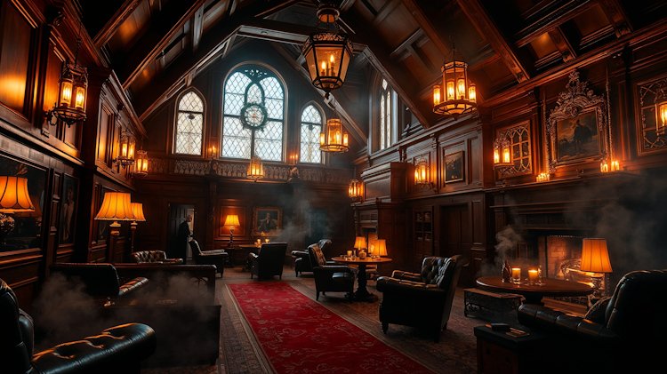The smoking lounge fills the eastern wing, its heavy velvet drapes filtering daylight into a perpetual twilight where cigars glow like fireflies, and the air hangs thick with the mingled scents of expensive tobacco and quiet ambition. Small mahogany tables anchor leather chairs into intimate arrangements, and a grand piano stands in the corner, played on occasion by hired musicians whose talent is exceeded only by their discretion. It is here, in the soft collision of smoke and whispered confidence, that the club's true commerce takes place — not the trading of goods or the signing of contracts, but the exchange of information, the forging of alliances, and the careful, bloodless destruction of rivals who never see the blow coming.
