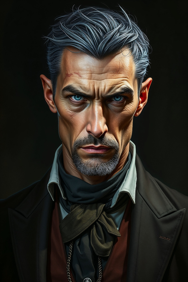 His dark hair has begun to gray, streaked with silver at the temples and throughout, kept cropped short in a practical military cut that requires no maintenance and offers no handhold in a fight. His face is angular and weathered, marked by old scars that have faded to pale lines against tanned skin. His eyes are pale gray, cold and assessing, the eyes of a man who evaluates everyone he meets as either a potential asset, a potential obstacle, or irrelevant.